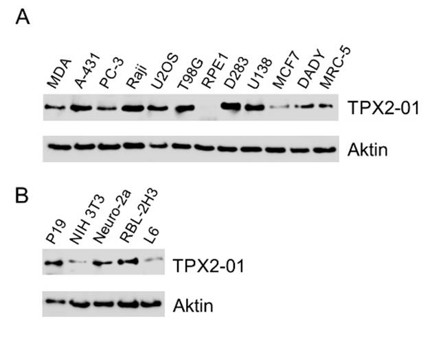 Western blotting analysis of TPX2 using monoclonal antibody TPX2-01 in A) human cell lines, B) murine (P19, NIH 3T3, Neuro-2a) and rat (RBL-2H3, L6) cell lines.
