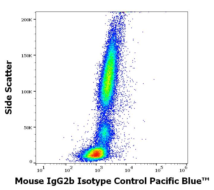 Flow cytometry surface nonspecific staining pattern of human peripheral whole blood stained using mouse IgG2b Isotype control (MPC-11) Pacific Blue™ antibody (concentration in sample 15 μg/ml).