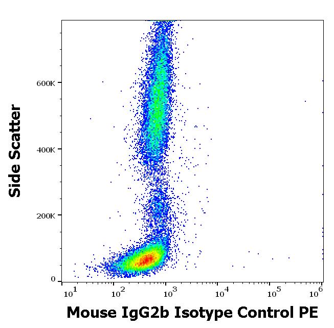 Flow cytometry surface nonspecific staining pattern of human peripheral whole blood stained using mouse IgG2b Isotype control (MPC-11) PE antibody (concentration in sample 5 μg/ml).