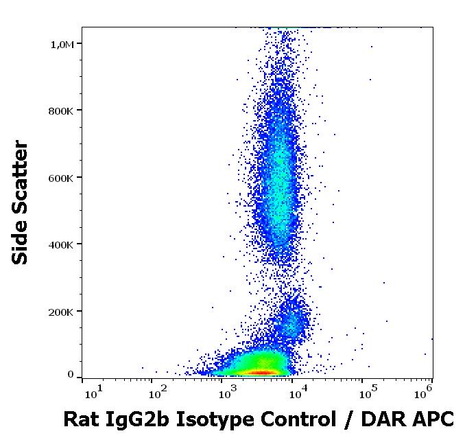 Flow cytometry surface nonspecific staining pattern of human peripheral whole blood stained using rat IgG2b Isotype control (RTG2B1-2) purified antibody (concentration in sample 3 μg/ml, DAR APC).