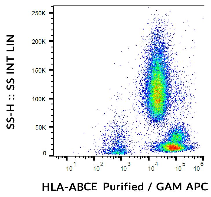 Flow cytometry analysis (surface staining) of human peripheral blood cells using anti-HLA-ABCE (TP25.99SF) purified, GAM-APC.