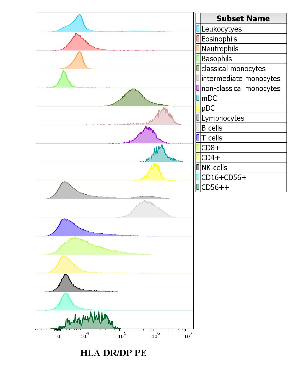 Expression profiling on peripheral blood subsets using Anti-human HLA-DR/DP PE antibody (clone MEM-136).