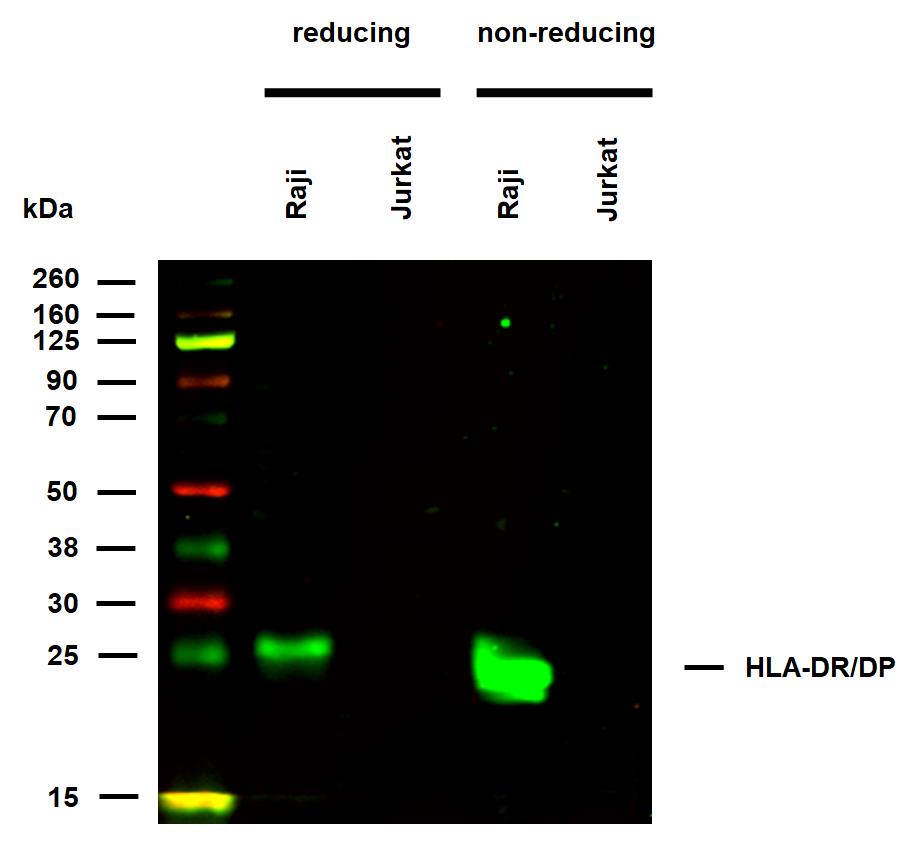 HLA-DR/DP molecules were detected at ~25 kDa in Raji cell line.