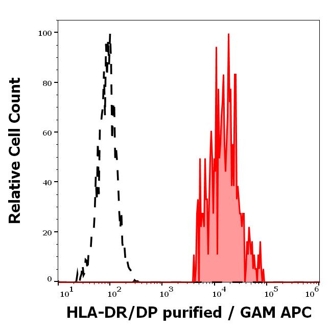 Separation of human HLA-DR/DP positive lymphocytes (red-filled) from HLA-DR/DP negative lymphocytes (black-dashed) in flow cytometry analysis (surface staining) of human peripheral whole blood stained using anti-human HLA-DR/DP (HL-38) purified antibody (concentration in sample 6 μg/ml, GAM APC).