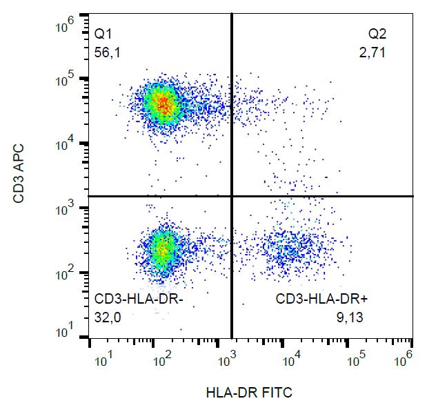 Flow cytometry analysis (surface staining) of HLA-DR in human peripheral blood with anti-HLA-DR (L243) FITC.
