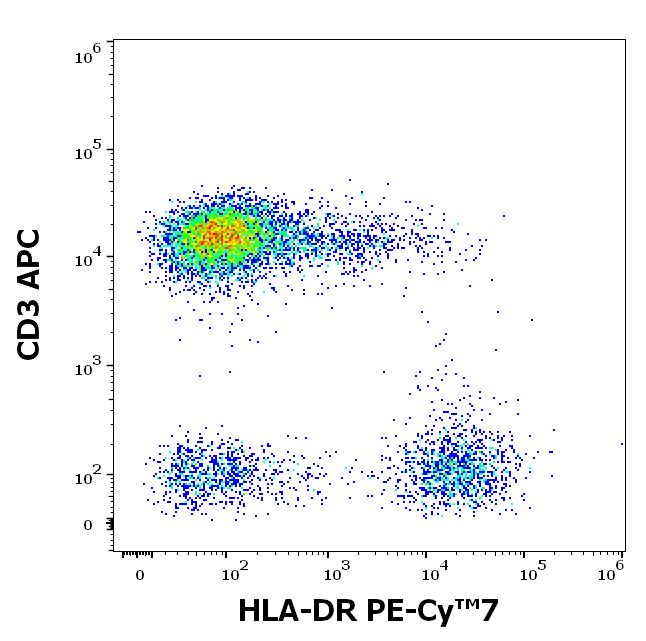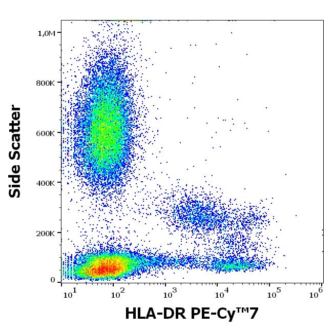 Flow cytometry surface staining pattern of human peripheral whole blood stained using anti-human HLA-DR (L243) PE-Cy™7 antibody (concentration in sample 0.33 μg/ml).