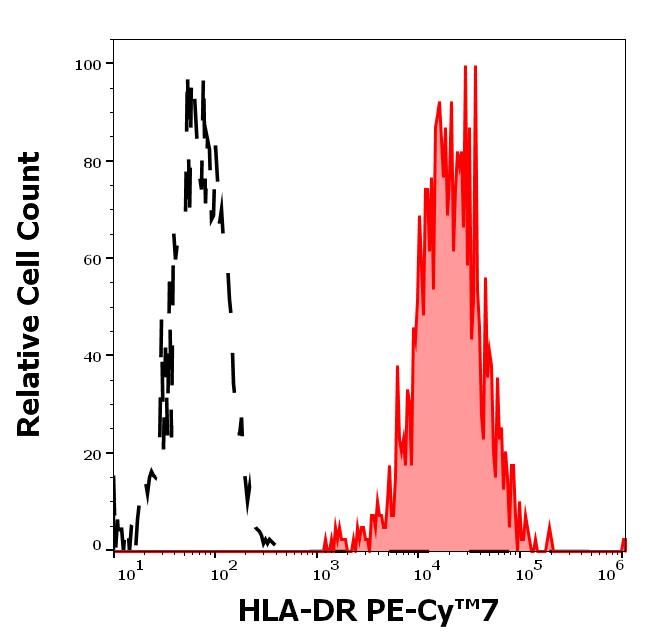 Separation of human HLA-DR positive CD3 negative lymphocytes (red-filled) from neutrophil granulocytes (black-dashed) in flow cytometry analysis (surface staining) of human peripheral whole blood stained using anti-human HLA-DR (L243) PE-Cy™7 antibody (concentration in sample 0.33 μg/ml).