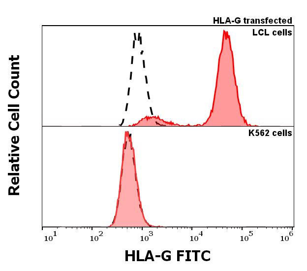 Anti-human HLA-G FITC (G233) antibody (concentration in sample 5 μg/ml, red-filled histogram) binds specifically to HLA-G expressed on surface of HLA-G transfected LCL cells (upper panel), but not to surface of K562 cells (lower panel). Level of non-specific binding was assessed using Mouse IgG2a isotype control FITC antibody (MOPC-173) under same conditions (concentration in sample 5 μg/ml, black-dashed histogram).