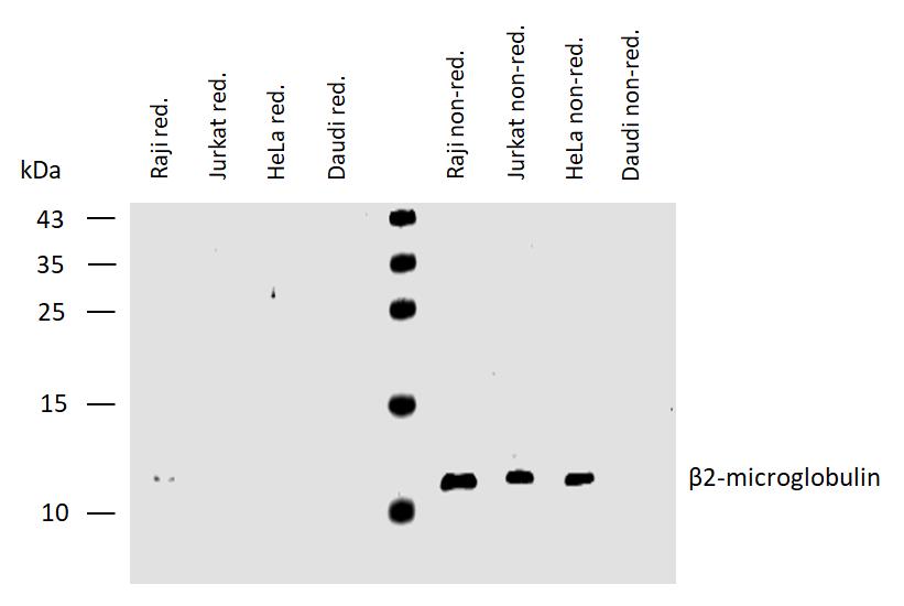 Western blotting analysis of human β2-microglobulin using mouse monoclonal antibody B2M-01 on lysates of various cell lines under reducing and non-reducing conditions. Nitrocellulose membrane was probed with 2 µg/ml of mouse monoclonal antibody followed by IRDye800-conjugated anti-mouse secondary antibody. β2-microglobulin was detected around 12 kDa.