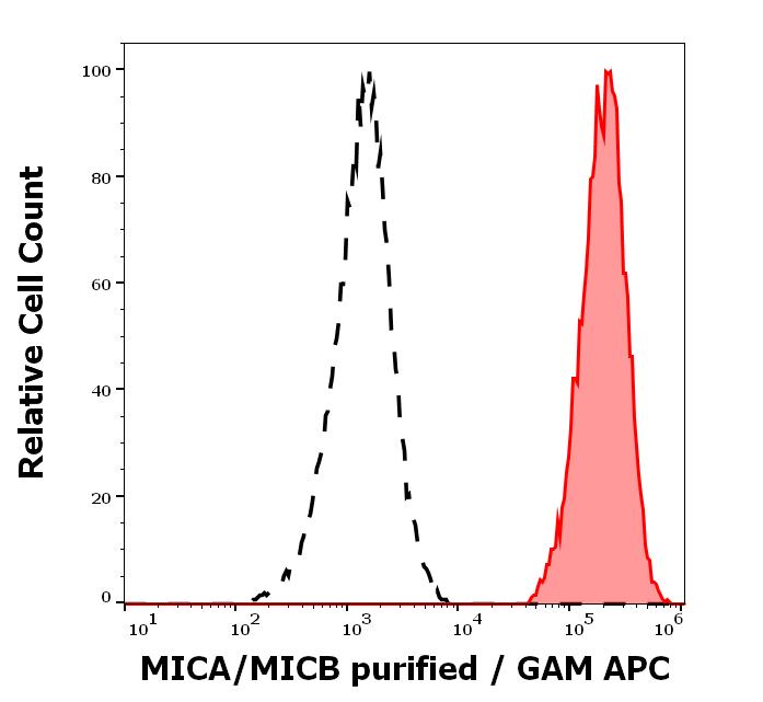Separation of human HeLa cells (red-filled) from leukocytes (black-dashed) in flow cytometry analysis (surface staining) of human peripheral whole blood spiked with HeLa cells stained using anti-human MICA/MICB (6D4) purified antibody (concentration in sample 0.3 μg/ml, GAM APC).