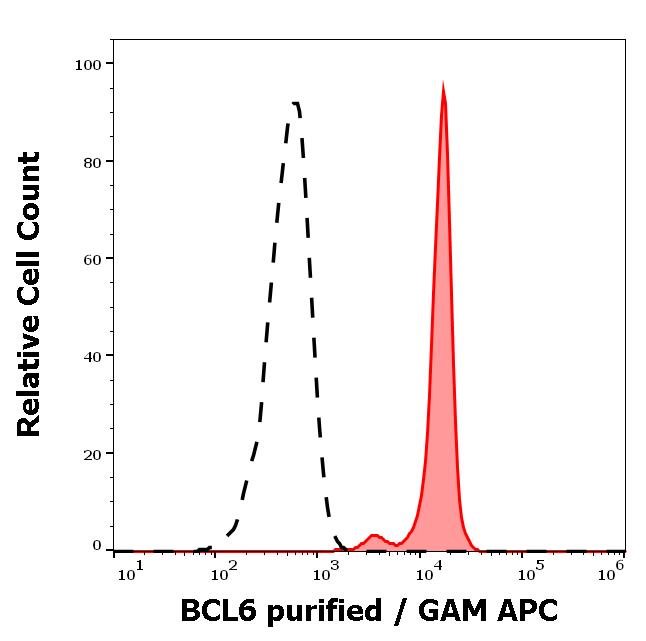 Separation of monocytes stained anti-human BCL6 (IG191E/A8) purified antibody (concentration in sample 5 μg/ml, GAM APC, red-filled) from monocytes unstained by primary antibody (GAM APC, black-dashed) in flow cytometry analysis (intracellular staining)