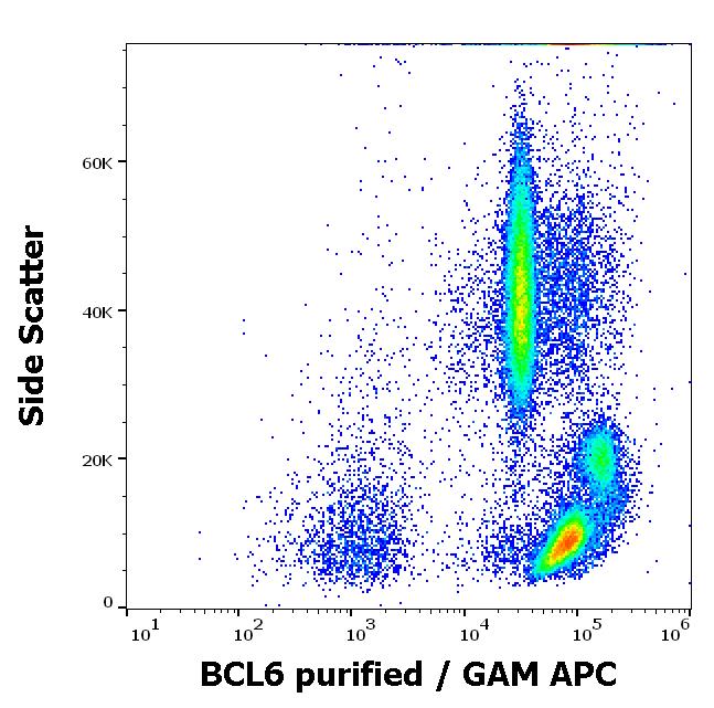 Flow cytometry intracellular staining pattern of human peripheral whole blood stained using anti-human BCL6 (IG191E/A8) purified antibody (concentration in sample 5 μg/ml, GAM APC).