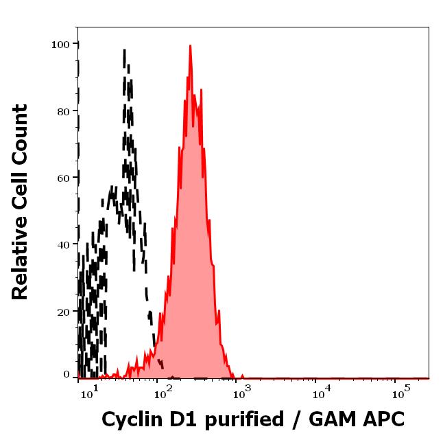 Separation of MCF-7 cells stained using anti-Cyclin D1 (CD1.1) purified antibody (concentration in sample 8 μg/ml, GAM APC, red-filled) from MCF-7 cells stained using mouse IgG1 isotype control (MOPC-21) purified antibody (concentration in sample 8 μg/ml, same as Cyclin D1 purified concentration, GAM APC, black-dashed) in flow cytometry analysis (intracellular staining).