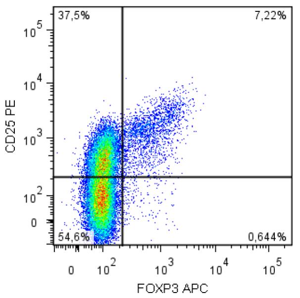 Flow cytometry analysis (intracellular staining) of human peripheral blood cells (gated on CD4+ cells) with anti-FoxP3 (clone 3G3).