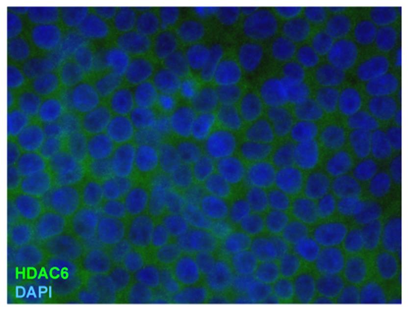 Immunocytochemistry staining of HDAC6 in formaldehyde-fixed and Triton-permeabilized HEK-293T cells by mouse monoclonal antibody 2H3, followed by anti-mouse Alexa Fluor 488 (green), DNA indicated by DAPI (blue).