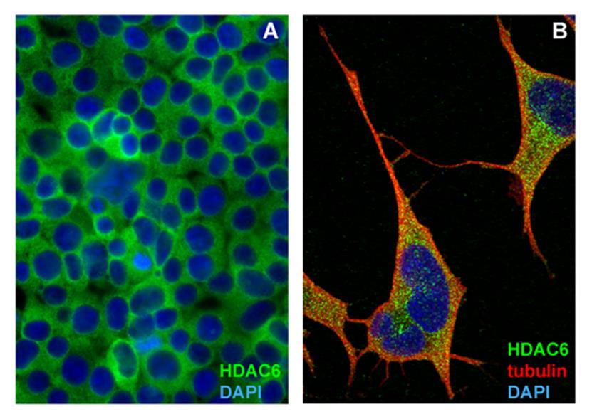 Immunocytochemistry staining of HDAC6 in formaldehyde-fixed and Triton-permeabilized HEK-293T cells (A) and SH-SY5Y cells (B) by mouse monoclonal antibody 159, followed by anti-mouse Alexa Fluor 488 (green), DNA indicated by DAPI (blue). In SH-SY5Y cells tubulin was stained by a rabbit polyclonal antibody, followed by anti-rabbit Alexa Fluor 647 (red, colocalization yellow).