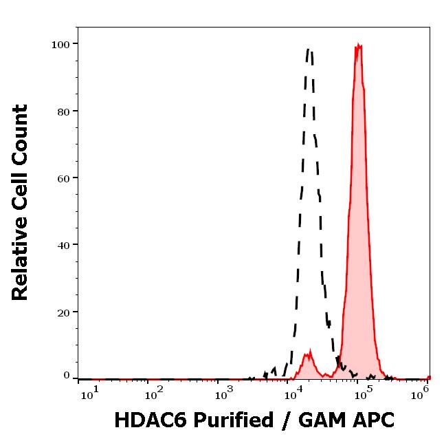 Separation of K562 cells stained using anti-HDAC6 (159) purified antibody (concentration in sample 4,0 μg/ml, GAM APC, red-filled) from K562 cells unstained by primary antibody (GAM APC, black-dashed) in flow cytometry analysis (intracellular staining).