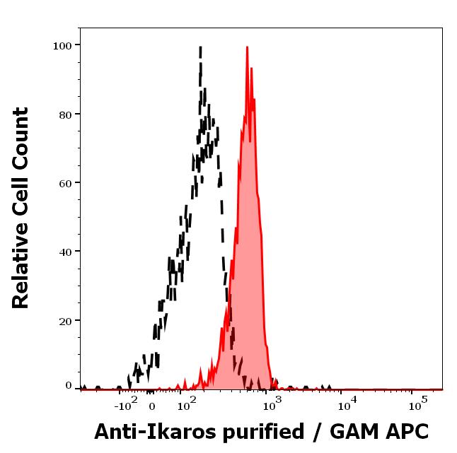 Separation of human monocytes stained using anti-Ikaros (4E9) purified antibody (concentration in sample 8 μg/ml, GAM APC, red-filled) from monocytes stained using mouse IgG1 isotype control (MOPC-21) purified antibody (concentration in sample 8 μg/ml, same as Ikaros purified, GAM APC, black-dashed) in flow cytometry analysis (intracellular staining).