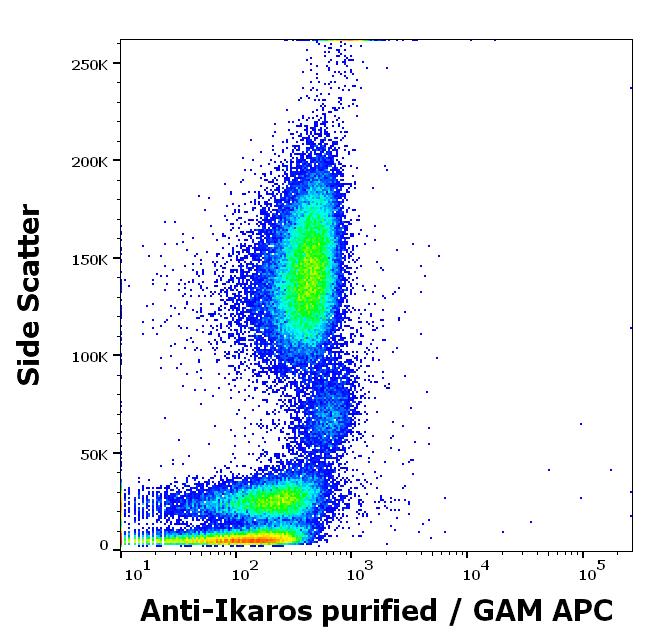 Flow cytometry intracellular staining pattern of human peripheral whole blood stained using anti-Ikaros (4E9) purified antibody (concentration in sample 8 μg/ml, GAM APC).