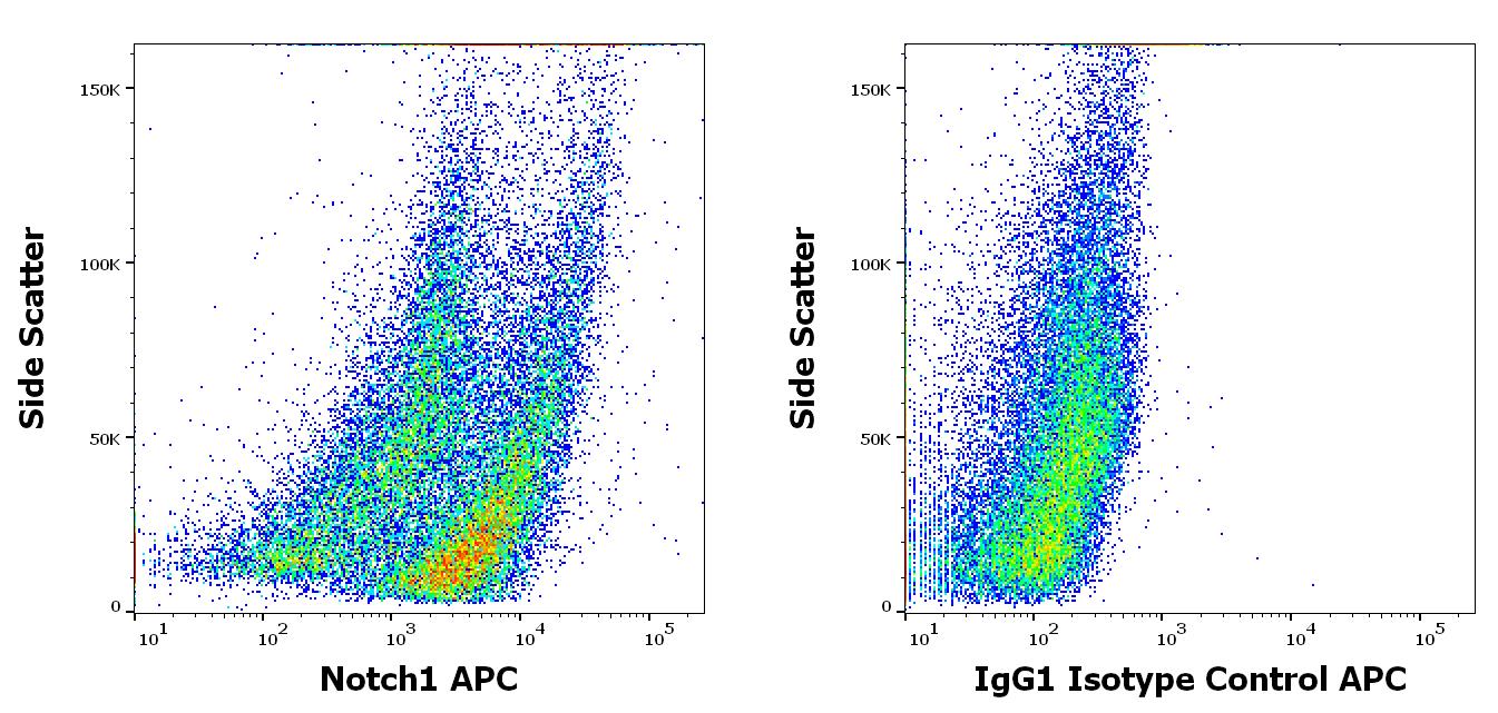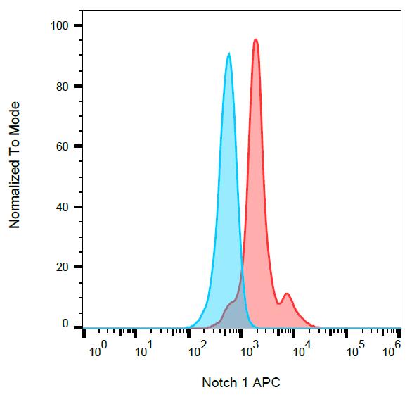 Separation of MOLT-4 cell line (red) from Leukocytes(blue) in flow cytometry analysis (intracellular staining) stained using anti-human Notch1 (mN1A) APC antibody (concentration in sample 3 μg/ml).