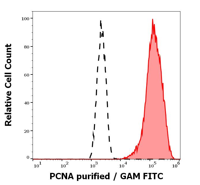 Separation of K562 cells stained using anti-PCNA (PC10) purified antibody (concentration in sample 4 μg/ml, GAM FITC, red-filled) from K562 cells unstained by primary antibody (GAM FITC, black-dashed) in flow cytometry analysis (intracellular staining).