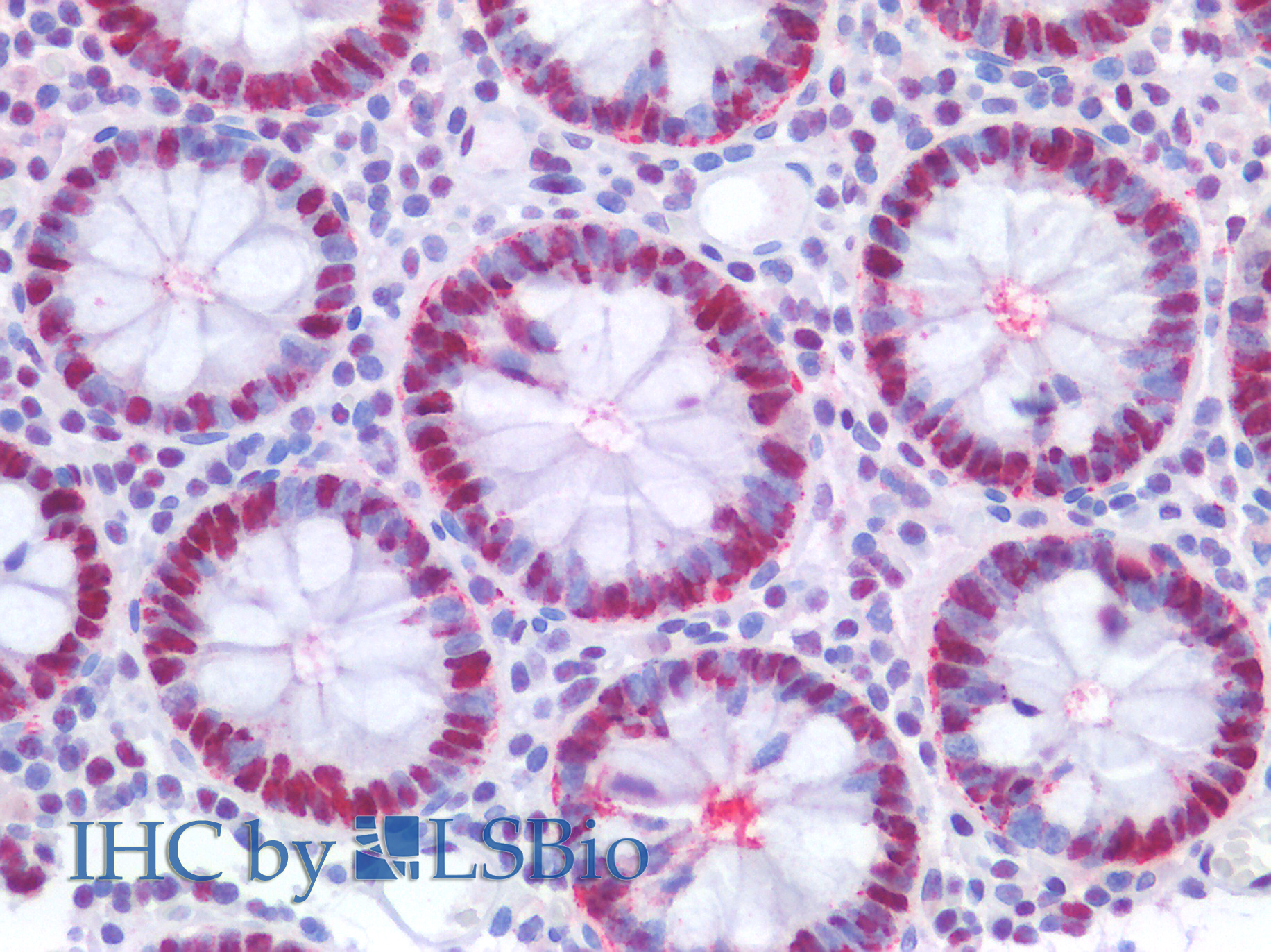 Immunohistochemistry staining of human colon (paraffin-embedded sections) with anti-PCNA (PC10), 10 μg/ml. Commercially tested by LifeSpan BioSciences.