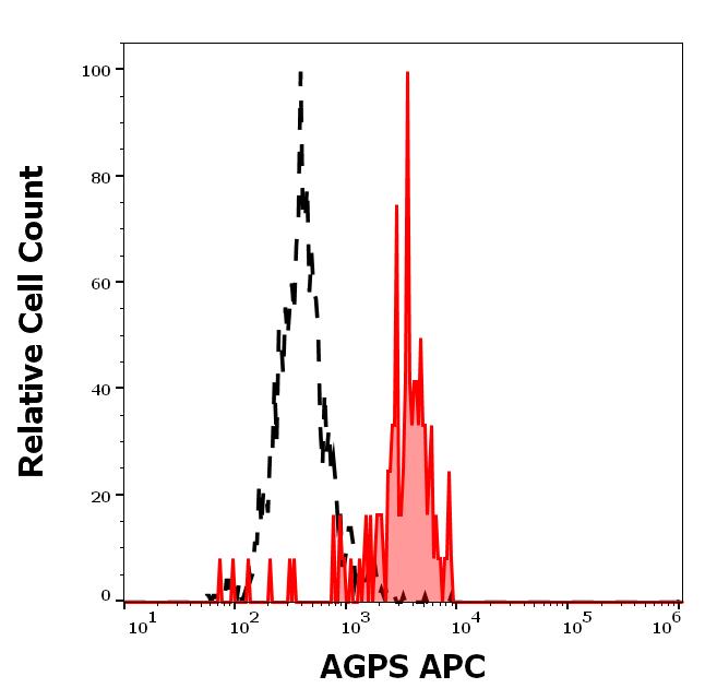 Separation of A431 cells stained using anti-AGPS (MHD4-46) APC antibody (10 μl reagent per million cells in 100 μl of cell suspension, red-filled) from A431 cells stained using mouse IgG2a isotype control (MOPC-173) APC antibody (concentration in sample 5 μg/ml, same as AGPS APC antibody concentration, black-dashed) in flow cytometry analysis (intracellular staining).