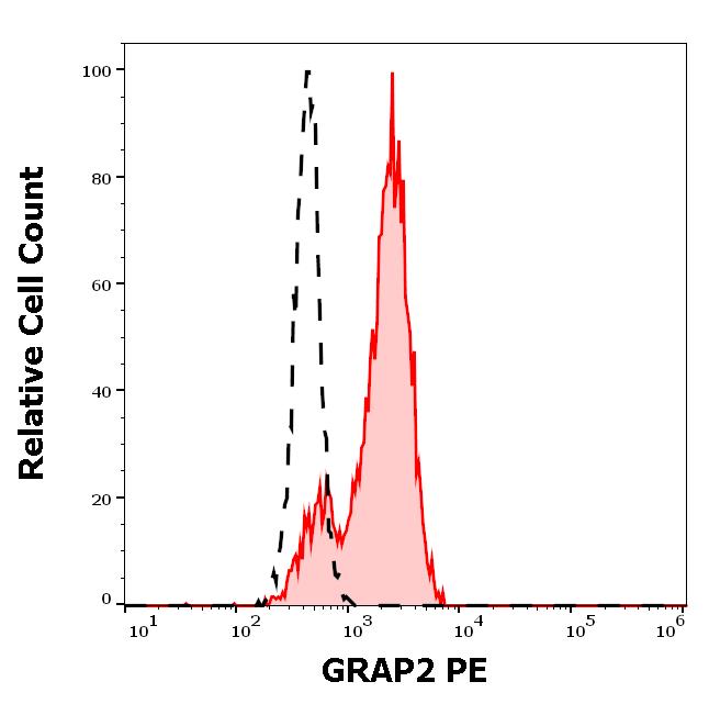 Separation of lymphocytes stained using anti-human GRAP2 (UW40) PE antibody (concentration in sample 1,7 μg/ml, red-filled) from lymphocytes stained using mouse IgG2a isotype control (MOPC-173) PE antibody (concentration in sample 1,7 μg/ml, same as GRAP2 PE concentration, black-dashed) in flow cytometry analysis (intracellular staining) of peripheral blood.