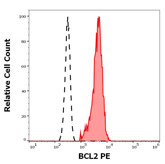 Separation of human BCL2 positive lymphocytes (red-filled) from neutrophil granulocytes (black-dashed) in flow cytometry analysis (intracellular staining) of human peripheral whole blood stained using anti-human BCL2 (Bcl-2/100) PE antibody (concentration in sample 1.67 μg/ml).