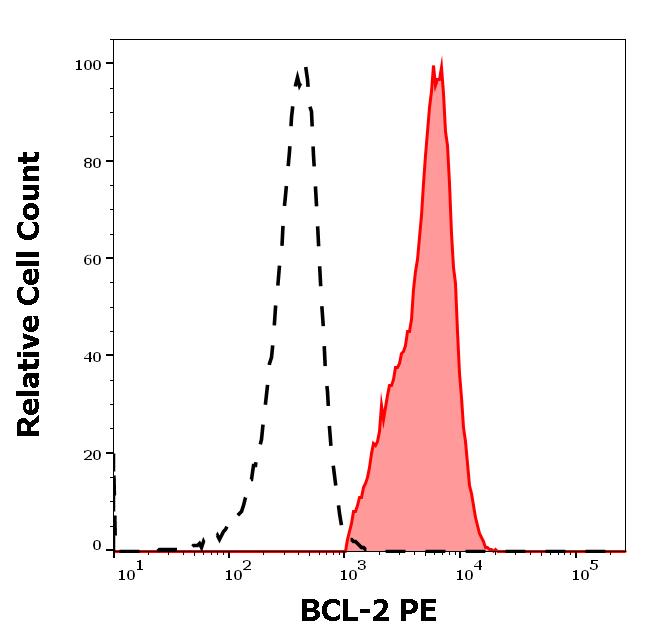 Separation of human BCL-2 positive CD19 positive lymphocytes (red-filled) from neutrophil granulocytes (black-dashed) in flow cytometry analysis (intracellular staining) of human peripheral whole blood from DLBCL patient stained using anti-human BCL2 (Bcl-2/100) PE antibody (10 μl reagent / 100 μl of peripheral whole blood).