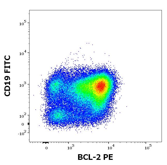 Flow cytometry multicolor staining of human lymphocytes stained using anti-human BCL2 (Bcl-2/100) PE antibody (intracellular staining, 10 μl reagent / 100 μl of peripheral whole blood from DLBCL patient) and anti-human CD19 (LT19) FITC antibody (surface staining, 20 μl reagent / 100 μl of peripheral whole blood from DLBCL patient).