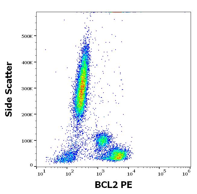 Flow cytometry intracellular staining pattern of human peripheral whole blood from diffuse large B-cell lymphoma (DLBCL) patient. Sample was stained using anti-human BCL2 (Bcl-2/100) PE antibody (10 μl reagent / 100 μl of peripheral whole blood).