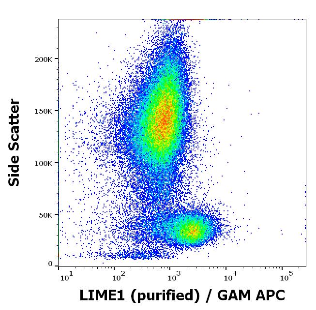 Flow cytometry intracellular staining pattern of human peripheral whole blood using anti-LIME1 (LIME-06) purified antibody (concentration in sample 9 μg/ml, GAM APC).