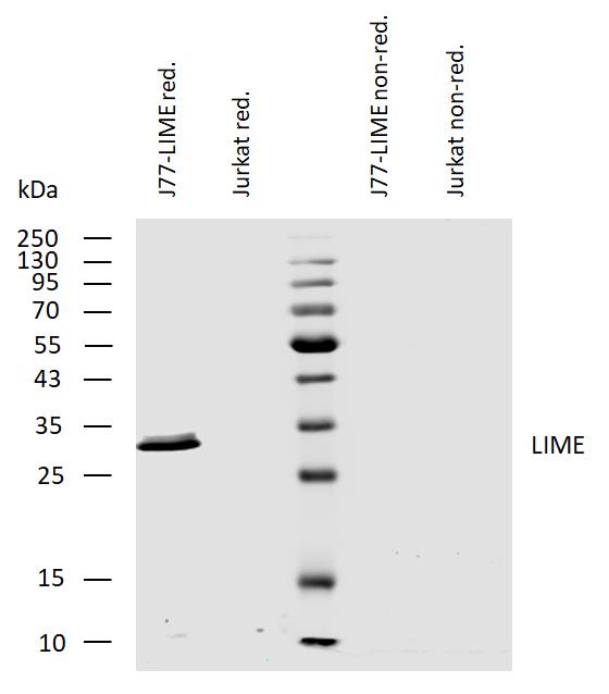 Western blotting analysis of human LIME using mouse monoclonal antibody LIME-10 on lysates of J77-LIME transfectants and Jurkat cells under reducing and non-reducing conditions. Nitrocellulose membrane was probed with 1 µg/ml of mouse monoclonal antibody followed by IRDye800-conjugated anti-mouse secondary antibody. LIME was detected around 30 kDa.
