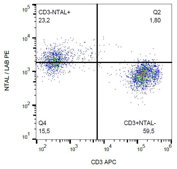 The antibody NAP-07 reacts with an intracellular epitope of Non-T cell activation linker (NTAL), also known as LAB (linker of activated B cells), a 25 - 30 kDa transmembrane adaptor protein associating with lipid raft components in the plasma membrane of B lymphocytes, NK cells and myeloid cells.