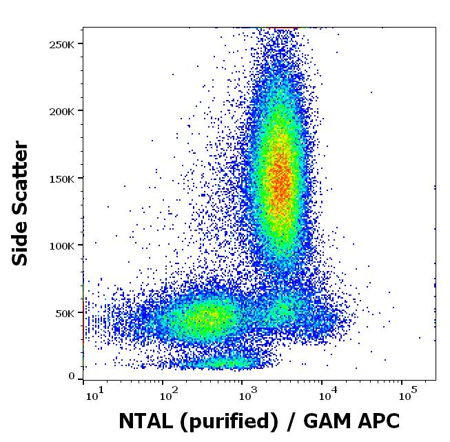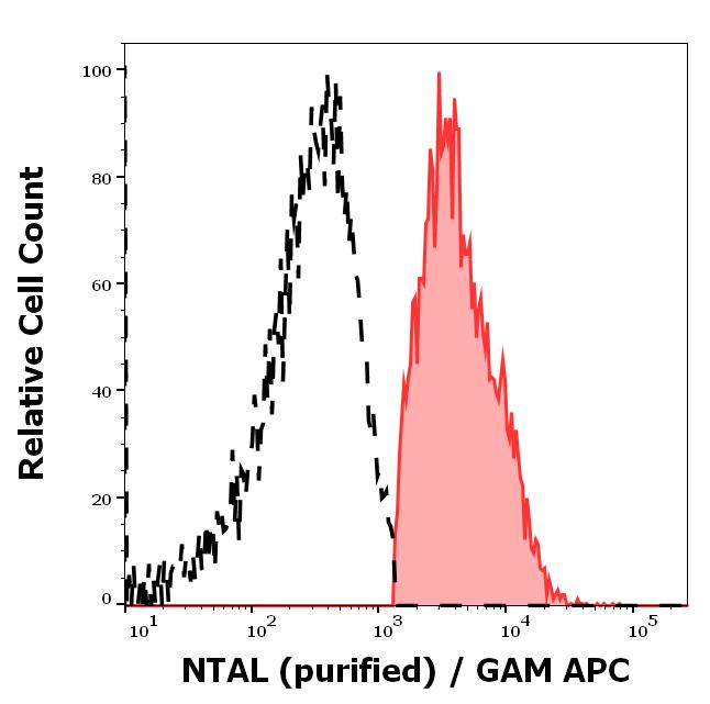 Separation of human CD3 negative NTAL positive lymphocytes (red-filled) from CD3 positive NTAL negative lymphocytes (black-dashed) in flow cytometry analysis (intracellular staining) of peripheral whole blood stained using anti-NTAL (NAP-07) purified antibody (concentration in sample 9 μg/ml, GAM APC).