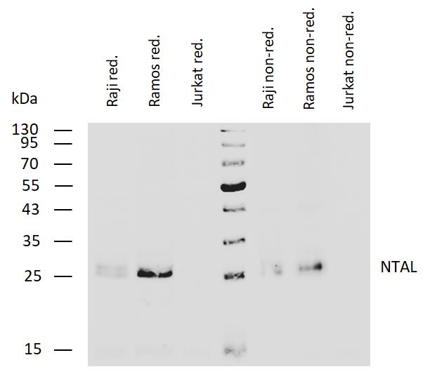 Western blotting analysis of human NTAL using mouse monoclonal antibody NAP-07 on lysates of Raji and Ramos cells and on Jurkat cells (negative control) under reducing and non-reducing conditions. Nitrocellulose membrane was probed with 2 µg/ml of mouse monoclonal antibody followed by IRDye800-conjugated anti-mouse secondary antibody. NTAL was detected around 27 kDa.
