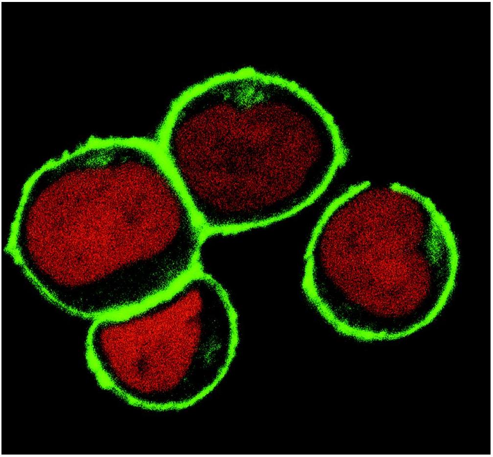 Immunocytochemistry analysis of NTAL by confocal microscopy in THP-1 human acute monocytic leukemia cell line. The cells were permeabilized and immunostained using anti-NTAL (NAP-07; green). Nuclei are vizualized by propidium iodide (red).