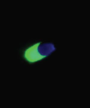 Immunocytochemistry staining of capacitated boar sperm. Acrosome visualized using mouse monoclonal ACR-2 (purified; secondary antibody labeled with FITC, green), DNA stained with DAPI (blue).
