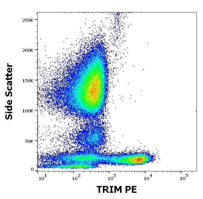 Flow cytometry intracellular staining pattern of human peripheral whole blood stained using anti-TRIM (TRIM-04) PE antibody (concentration in sample 1 μg/ml).