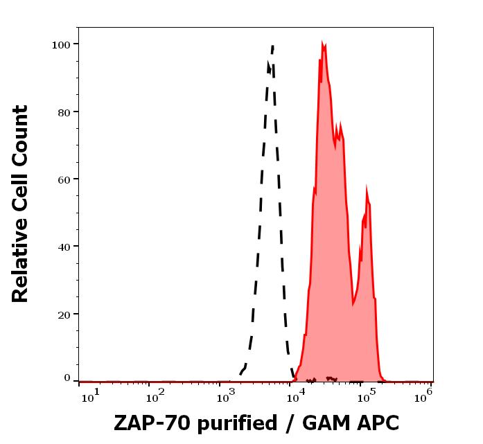 Separation of human ZAP70 positive lymphocytes (red-filled) from neutrophil granulocytes (black-dashed) in flow cytometry analysis (intracellular staining) of human peripheral whole blood stained using anti-ZAP70 (1E7.2) purified antibody (concentration in sample 5 μg/ml, GAM APC).