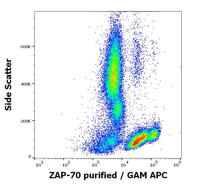 Flow cytometry intracellular staining pattern of human peripheral whole blood stained using anti-ZAP70 (1E7.2) purified antibody (concentration in sample 5 μg/ml, GAM APC).
