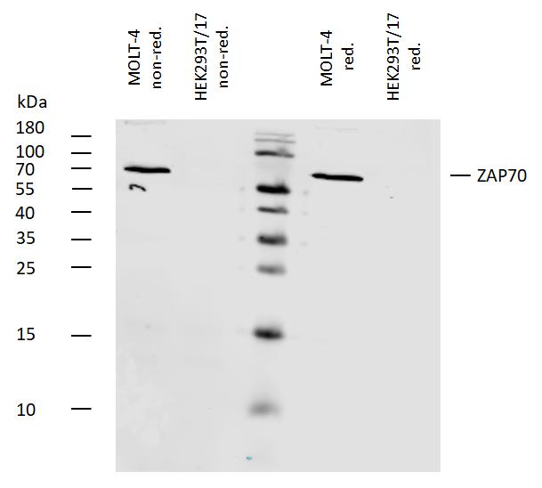 Western blotting analysis of human ZAP70 using mouse monoclonal antibody 1E7.2 on lysates of MOLT-4 cell line and HEK293T/17 cell line (ZAP70 non-expressing cell line; negative control) under non-reducing and reducing conditions. Nitrocellulose membrane was probed with 2 µg/ml of mouse anti-ZAP70 monoclonal antibody 1E7.2 followed by IRDye800-conjugated anti-mouse IgG1 secondary antibody. A specific band was detected for ZAP70 protein at approximately 70 kDa.