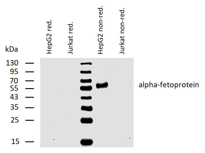 Western blotting analysis of human alpha-fetoprotein using mouse monoclonal antibody AFP-01 on lysates of HepG2 cell line and Jurkat cell line (negative control) under reducing and non-reducing conditions. Nitrocellulose membrane was probed with 2 µg/ml of mouse monoclonal antibody anti-alpha-fetoprotein followed by IRDye800-conjugated anti-mouse secondary antibody. Alpha-fetoprotein was detected at approximately 60 kDa.