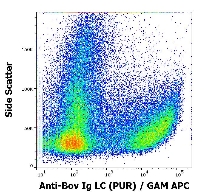 Flow cytometry surface staining pattern of bovine peripheral whole blood stained using anti-bovine Ig Light Chains (IVA285-1) purified antibody (concentration in sample 3 μg/ml, GAM APC).