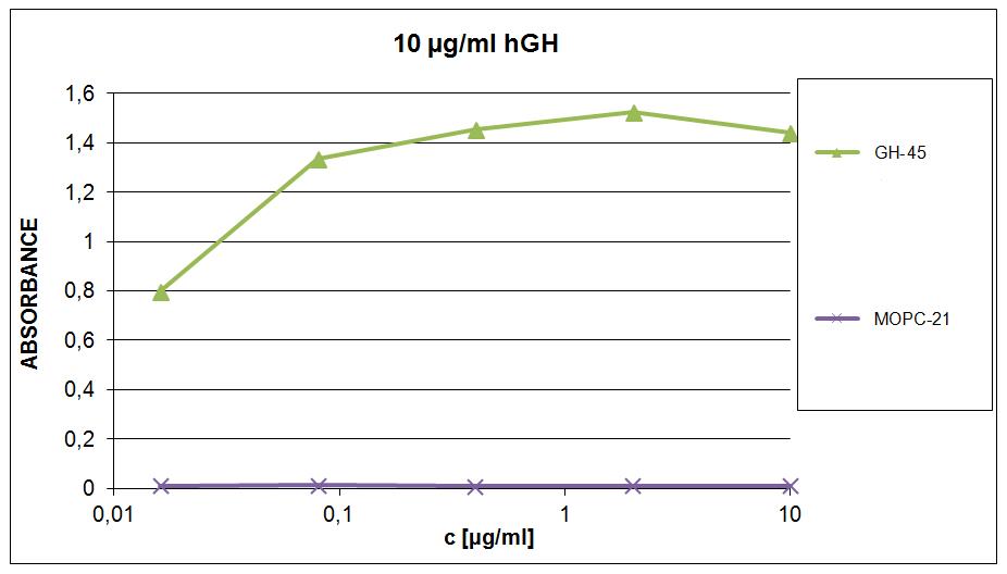 ELISA of human growth hormone using mouse monoclonal antibody GH-45. Compared with mouse IgG1 isotype control antibody MOPC-21.