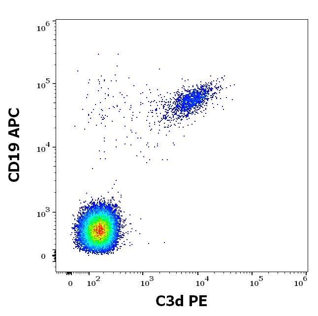 Flow cytometry multicolor surface staining pattern of human lymphocytes stained using anti-human CD19 (LT19) APC antibody (10 μl reagent / 100 μl of peripheral whole blood) and anti-human C3d (BGRL11) PE antibody (concentration in sample 0.56 μg/ml).