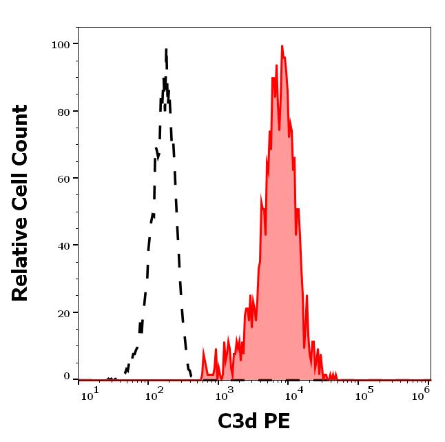 Separation of human CD19 positive C3d positive B cells (red-filled) from CD19 negative C3d negative lymphocytes (black-dashed) in flow cytometry analysis (surface staining) of human peripheral whole blood stained using anti-human C3d (BGRL11) PE antibody (concentration in sample 0.56 μg/ml).
