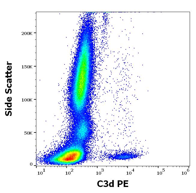 Flow cytometry surface staining pattern of human peripheral whole blood stained using anti-human C3d (BGRL11) PE antibody (concentration in sample 0.56 μg/ml).