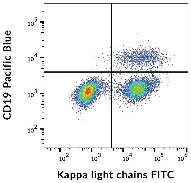 The antibody TB28-2 recognizes human Ig kappa light chains of both secreted and cell surface immunoglobulin. It detects also free kappa light chains.